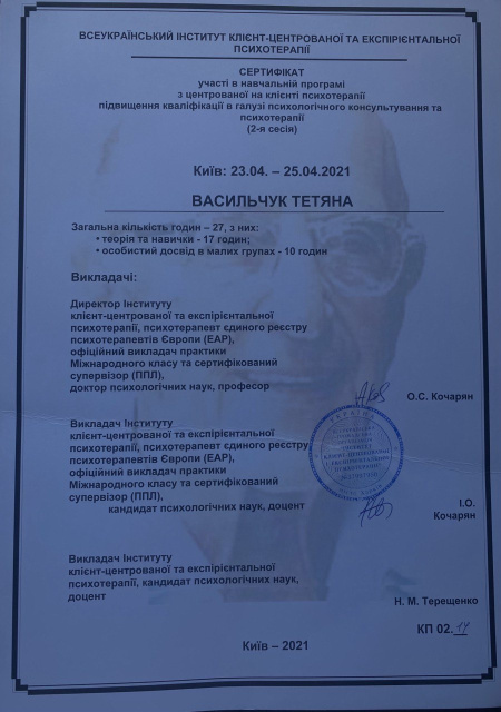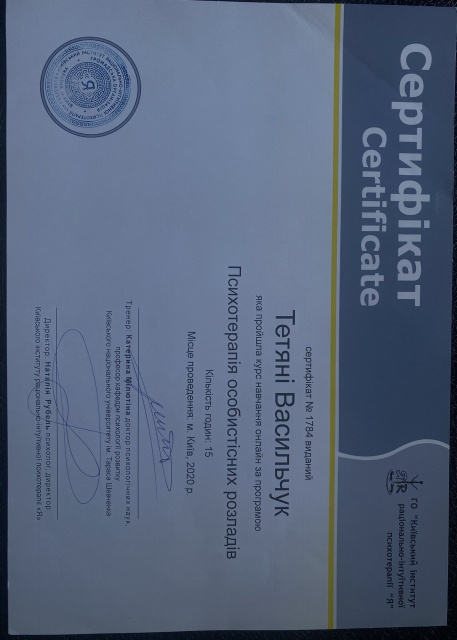- "Психотерапія особистісних розладів" в ГО "Київський інститут раціонально-інтуітивної психотерапії."