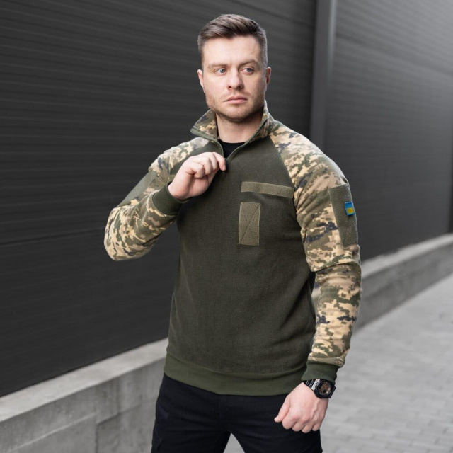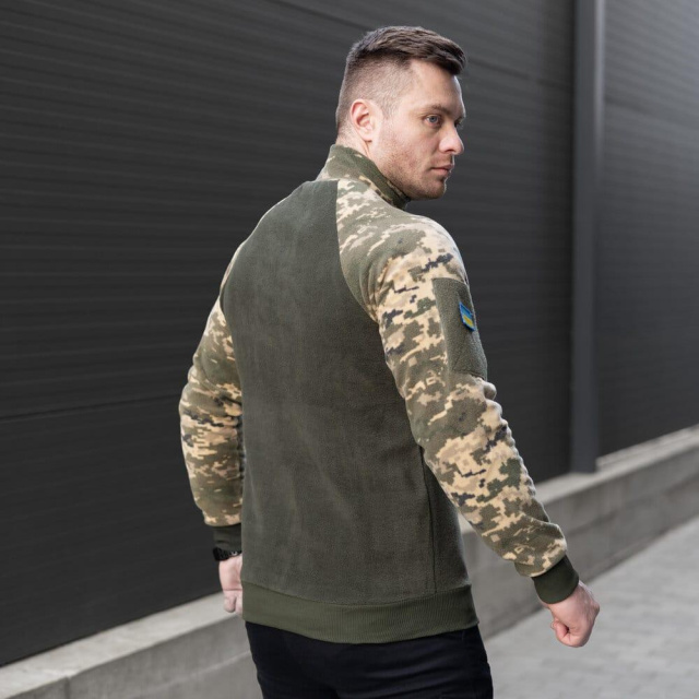 Тактична військова кофта чоловіча флісова з рукавами камуфляж із якісного теплого флісу. Матеріал стійкий до утворення ковтунців, добре переться, тримає форму. Також матеріал відштовхує вологу, а не вбирає її, завдяки чому добре зігріває та утримує тепло. Комірець стійка. Є дві бічні кишені на блискавці і дві кишені на блискавці на рукавах. П'ять місць під шеврони. В комплекті до кофти йде один шеврон - прапор України. Резинка внизу для регулювання ширини. Тактична чоловіча кофта маломірить. Розмір М відповідає стандартному розміру S, L відповідно М, ХL – L, ХХL – ХL, ХХХL – ХХL.